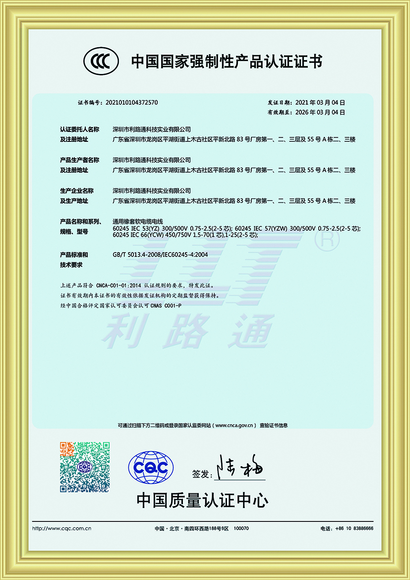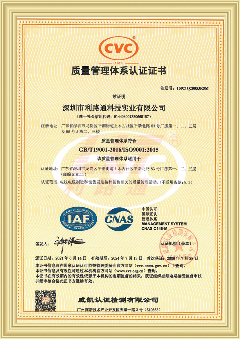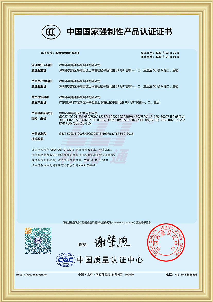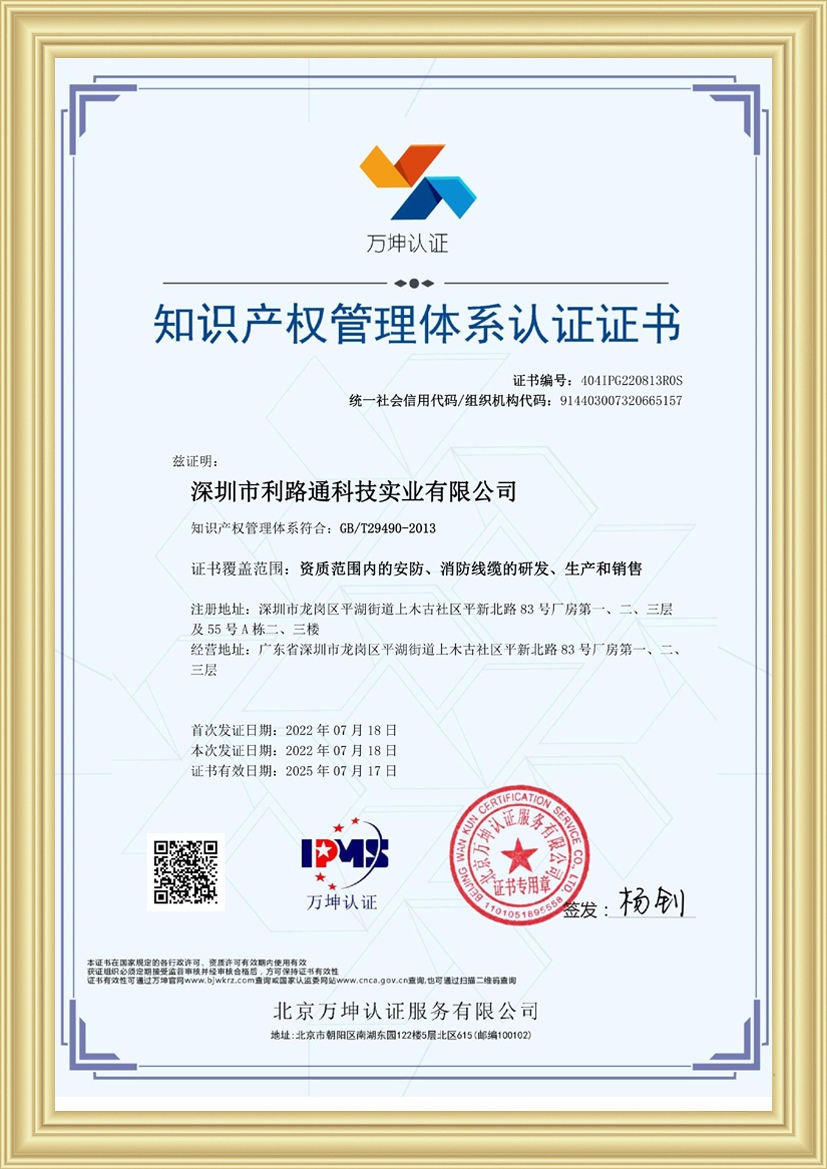 深圳市利路通科技實(shí)業(yè)有限公司成立于2001年,是一家主要從事防火線(xiàn)纜、硅膠線(xiàn)纜、橡膠線(xiàn)纜、低煙無(wú)鹵線(xiàn)纜、通訊線(xiàn)纜、漂浮線(xiàn)纜、耐寒線(xiàn)纜、控制線(xiàn)纜、柔性線(xiàn)纜、電梯線(xiàn)纜、機(jī)器人線(xiàn)纜、新能源專(zhuān)用線(xiàn)纜、光纖綜合線(xiàn)等全系列電線(xiàn)電纜的產(chǎn)品設(shè)計(jì)、研發(fā)、生產(chǎn)、銷(xiāo)售、工程方案銷(xiāo)售服務(wù)的綜合性企業(yè),產(chǎn)品廣泛應(yīng)用于消防與安防,通訊,新能源,太陽(yáng)能,高層樓宇,軌道交通,橋梁,工業(yè)4.0設(shè)備,船舶,航空,軍工等領(lǐng)域并榮獲深圳高新技術(shù)企業(yè)、全國(guó)守合同重信用企業(yè)、深圳市愛(ài)心企業(yè)、深圳市消防安防百?gòu)?qiáng)企業(yè)、電線(xiàn)電纜協(xié)會(huì)理事會(huì)單位、國(guó)家一級(jí)計(jì)量體系合格企業(yè)、中國(guó)優(yōu)秀民營(yíng)科技企業(yè)。